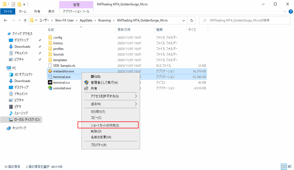 インストール時と同様の状態となるよう、terminal.exeとmetaeditor.exeのショートカットを作成します。