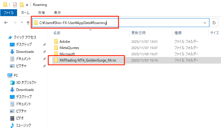 「MetaQuotes」フォルダは、各MT4/MT5のユーザーデータを保存するフォルダとなるため、名前を変更しないでください。